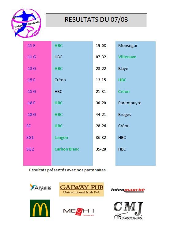 handball cubzaguais les résultats soyez les bienvenus Victoire des seniors filles 28 à 26 👏👏👏 Victoire de nos 18 filles 30-20 👏👏 Victoire de nos 15 filles 15-13👏👏👏👏 Victoire de nos -11 filles 19-8 contre Monsegur 👏👏👏 Victoire de nos -11 Filles 18-10 contre libourne 👏👏👏 Victoire de nos seniors garçons 29-27. 👏👏👏 Tous les résultats Nos partenaires
